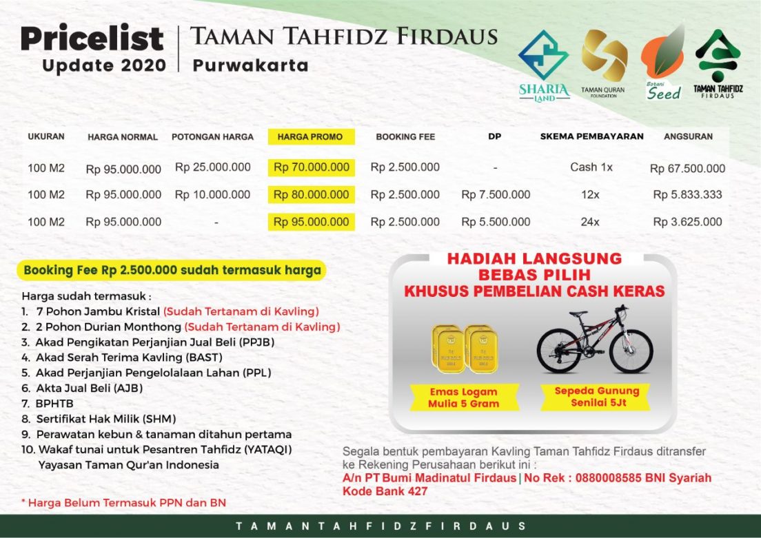 Dengan status kepemilikan kavling kebun adalah SHM atas nama pribadi. membeli kavling dapat dapat bonus seperti : 2 pohon durian monthong yang sudah tertanam, 7 pohon jambu kristal yang sudah tertanam, dan gratis pengelolaannya selama 1 tahun pertama oleh tim ahli botani.